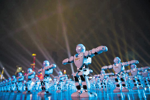 猴年春晚舞臺上,540個機(jī)器人集體為節(jié)目伴舞,舞姿整齊劃一?!皬V東智造”令人稱贊。(楊韶森攝)