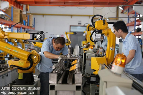 2015年8月25日,在浙江瑞宏機(jī)器人有限公司車間里,技術(shù)人員正在調(diào)試機(jī)器人。(魏煒攝/人民圖片)