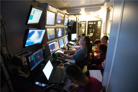 技術(shù)人員在“發(fā)現(xiàn)”號(hào)ROV操控室作業(yè)