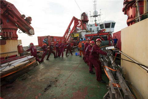 科研人員在“科學(xué)”號(hào)后甲板作業(yè)