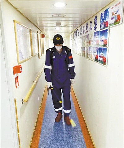 下圖 “科學(xué)”號科研人員進(jìn)行船艙內(nèi)消毒。