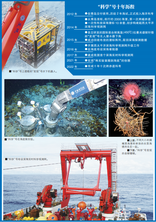 跨越赤道走向更遠(yuǎn)的深??瓶迹馕吨覈Q罂瓶荚谕卣拐J(rèn)知自然邊界、開辟新的認(rèn)知海域方面有了進(jìn)一步提高。作為我國自主設(shè)計和建造的新一代海洋科學(xué)綜合考察船,“科學(xué)”號的入列,使我國海洋科考真正具備了走向深海大洋的能力,而十年十次跨赤道科考,推動了我國深海探測與研究能力跨入世界先進(jìn)國家行列。