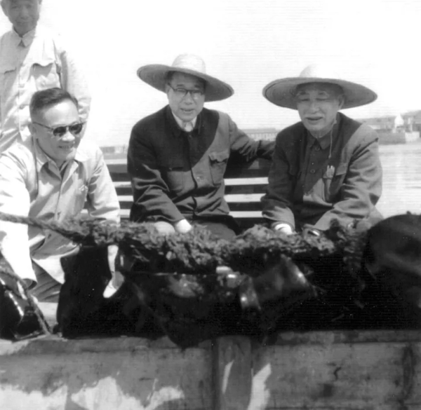 1965年6月4日,教育部部長(zhǎng)葉圣陶(右一)在時(shí)任海洋所副所長(zhǎng)曾呈奎(左一)、山東海洋學(xué)院生物系主任方宗熙的陪同下,在青島近海舢板上觀察海帶生長(zhǎng)情況。海洋所供圖