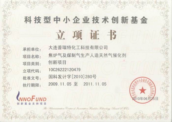 由中科院大連化學物理研究所控股公司之一——大連普瑞特化工科技有限公司申請的“焦爐氣及煤制氣生產(chǎn)人造天然氣催化劑”項目獲得國家科技型中小企業(yè)技術創(chuàng)新基金支持,日前已收到項目合同及立項證書,項目批準文號為“國科發(fā)計字【2010】280號”;項目支持經(jīng)費120萬元。