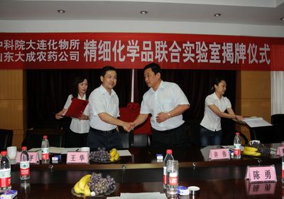 8月18日,“中國科學(xué)院大連化學(xué)物理研究所—山東大成農(nóng)藥股份有限公司‘精細(xì)化學(xué)品聯(lián)合實(shí)驗(yàn)室’”簽約及揭牌儀式在山東淄博舉行。山東大成化工集團(tuán)有限公司副總經(jīng)理兼山東大成農(nóng)藥股份有限公司副董事長許偉、山東大成化工集團(tuán)有限公司副總經(jīng)理滕軍、大連化物所副所長王華、鄭卓研究員、胡向平副研究員等出席了儀式。