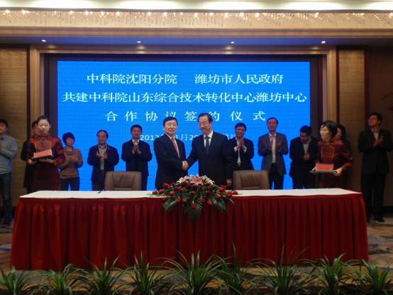 2012年11月20日,中科院沈陽分院和濰坊市人民政府“共建中科院山東綜合技術(shù)轉(zhuǎn)化中心濰坊中心合作協(xié)議”簽約儀式在濰坊舉行。中科院沈陽分院副院長韓恩厚,濰坊市市委常委、常務(wù)副市長陳白峰,山東省科技廳副廳長于書良,中科院沈陽分院院長助理、山東中心主任徐巖,中科院化學所、電工所、大連化物所、光電院青島光電工程技術(shù)研究中心的負責人和相關(guān)專家,以及山東省科技廳科技合作處、對外科技交流中心、濰坊市高新區(qū)、濱海區(qū)、發(fā)改委、經(jīng)信委、科技局和相關(guān)企業(yè)的負責人共計100余人參加了簽約儀式。簽約儀式由濰坊市副市長潘強主持。
