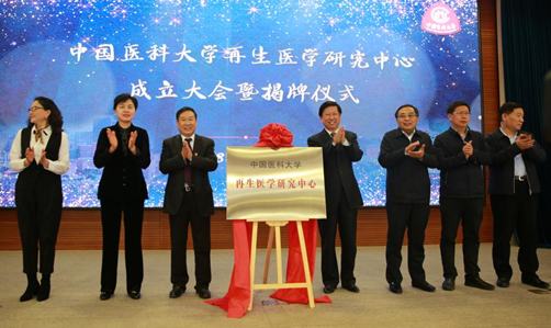 姬蘭柱和中國(guó)醫(yī)科大學(xué)黨委書記朱京海共同為“中國(guó)醫(yī)科大學(xué)再生醫(yī)學(xué)研究中心”揭牌。