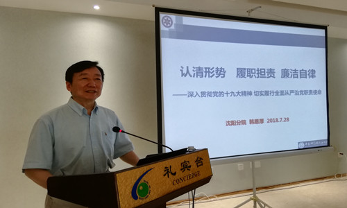 2018年7月28日,沈陽分院對(duì)分院系統(tǒng)所級(jí)領(lǐng)導(dǎo)干部開展廉潔教育,沈陽分院院長(zhǎng)韓恩厚作《認(rèn)清形勢(shì) 履職擔(dān)責(zé) 廉潔自律——深入貫徹黨的十九大精神 切實(shí)履行全面從嚴(yán)治黨職責(zé)使命》的專題報(bào)告,分院系統(tǒng)10個(gè)單位39位所級(jí)(班子成員)領(lǐng)導(dǎo)干部參加了學(xué)習(xí)。