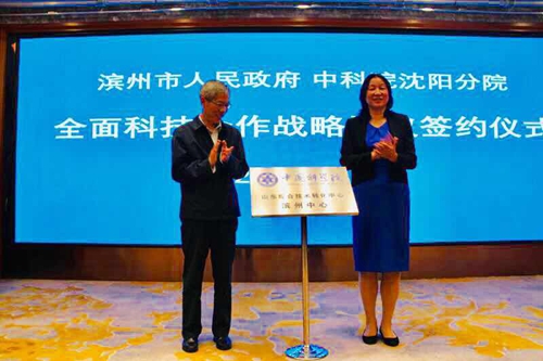 曹玉斌與馬越紅代表市院雙方簽署《濱州市人民政府 中國科學(xué)院沈陽分院全面科技合作戰(zhàn)略協(xié)議》、《濱州市人民政府 中國科學(xué)院沈陽分院共建中國科學(xué)院山東綜合技術(shù)轉(zhuǎn)化中心濱州中心協(xié)議》,并共同為“濱州中心”揭牌。