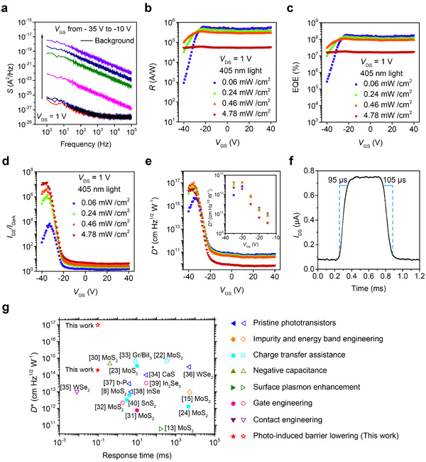 圖2. 光電性能表征與評價。a. 噪聲密度譜;b. 響應(yīng)度;c. 外量子效率;d. 信噪比;e. 探測度;f. 光響應(yīng)速度;g. 二維材料光電晶體管性能對比。