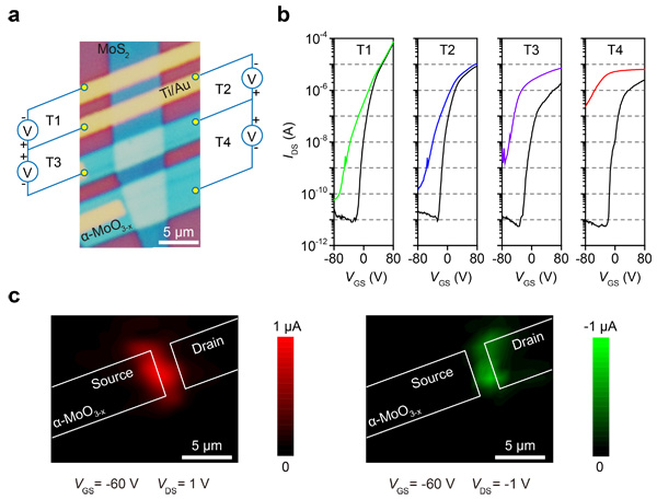 -MoO3-x);b. 光電晶體管在暗態(tài)(黑色)和光照(彩色)下的轉(zhuǎn)移特性曲線;c-d. 器件光電流的空間分布響應(yīng)圖。