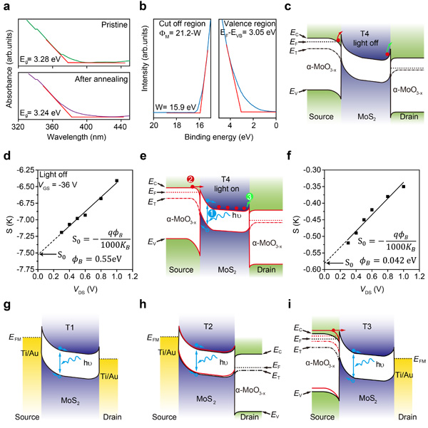 圖4 雙異質(zhì)結(jié)光致勢壘降低機(jī)制。a. 氧化鉬退火前后的吸收光譜;b. 氧化鉬的紫外光電子能譜;c.暗態(tài)下器件的能帶結(jié)構(gòu)圖;d.暗態(tài)下器件的肖特基勢壘高度定量表征;e.光照下器件的能帶結(jié)構(gòu)圖;f. 光照下器件的肖特基勢壘高度定量表征;g. 器件T1(Ti/Au, Ti/Au)的工作原理圖;h. 器件T2(
