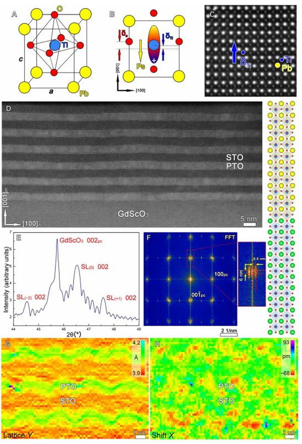 圖1:(A, B, C) PbTiO3單胞示意圖與極化方向的判定;(D, E) HAADF-STEM圖像和 ~2 XRD結(jié)構(gòu)和生長質(zhì)量表征;(F) 傅里葉變換;(G, H) 晶格常數(shù)與離子位移信息。