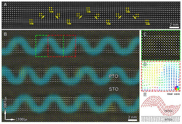 圖2:(A) 一個PbTiO3/SrTiO3周期的HAADF-STEM圖像;(B, C, D) 電偶極子波的極化分布圖與細(xì)節(jié)圖;(E) 一個電偶極子波的示意圖。