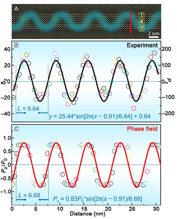 圖3:(A) 一個PbTiO3/SrTiO3周期的極化分布圖像;(B, C) 電偶極子波的正弦函數(shù)關(guān)系曲線擬合。