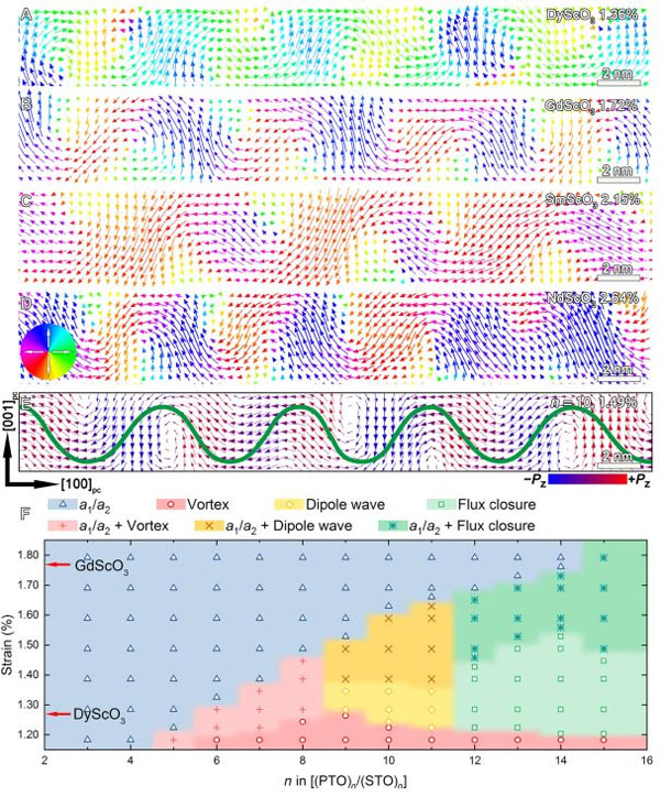 圖4:(A, B, C, D) 不同應(yīng)變條件下一個PbTiO3/SrTiO3周期的極化波極化分布圖;(E) 極化波的相場模擬圖;(F) PbTiO3/SrTiO3超晶格的應(yīng)變-厚度相圖。