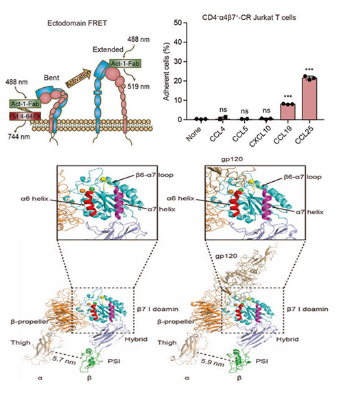 測量整合素 4 7 I結(jié)構(gòu)域與細胞膜距離延展程度的FRET實驗(左上);不同趨化因子刺激表達整合素 4 7 T細胞與gp120吸附情況(右上);整合素 4 7頭部結(jié)構(gòu)域構(gòu)象重排的分子細節(jié)及與gp120結(jié)合的分子基礎(chǔ)(下圖)