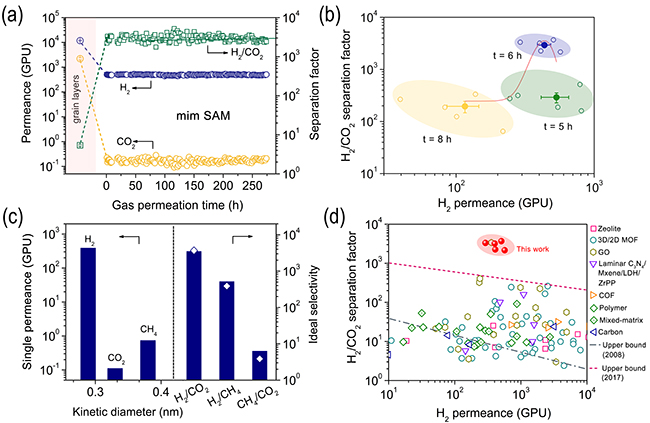 本工作中,該團(tuán)隊(duì)借助具有開放金屬位的活性基層,誘導(dǎo)mim蒸氣分子在活性基層上定向“著陸”,實(shí)現(xiàn)“零維分子”的有序組裝,形成高度取向的超分子陣列膜(Supramolecule array membrane, SAM),即“零維”分子篩膜,可利用該分子篩膜的埃米級(jí)分子間隔,實(shí)現(xiàn)精確篩分具有微小尺寸差異的H2(0.289nm)和CO2(0.33nm)分子。研究發(fā)現(xiàn),“零維”分子篩膜中的構(gòu)筑基元憑借超分子的相互作用有序聚集,可全面消除經(jīng)典分子篩膜的晶間缺陷,與目前性能最優(yōu)的分子篩膜相比,其H2和CO2的分離選擇性提高了一個(gè)數(shù)量級(jí)?!傲憔S”分子篩膜以“零維分子”直接作為基元構(gòu)筑新一代分子篩膜,該理念變革了傳統(tǒng)分子篩膜的構(gòu)筑基元類型、微觀堆砌模式和分離傳輸通道,對(duì)分子篩膜的發(fā)展具有重要指導(dǎo)意義。
