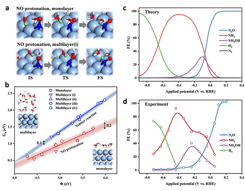 (a)-(b) 驗證單層水模型計算電化學(xué)能壘的可靠性;(c)-(d) 理論和和實驗法拉第效率對比。