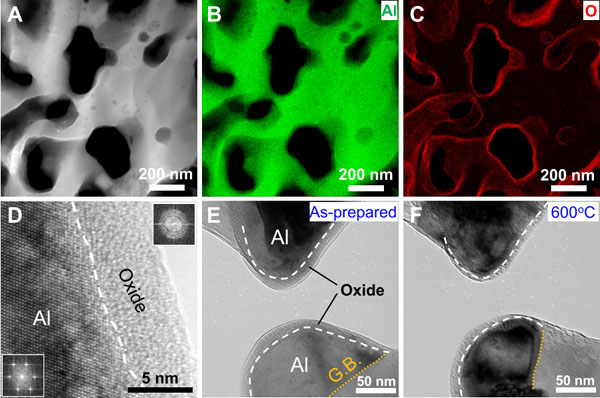 圖1 納米多孔鋁的結(jié)構(gòu)表征。(A-C)納米多孔鋁孔棱的HAADF-STEM圖像和EDS元素分布圖;(D)納米多孔鋁孔棱的HRTEM圖像;(E,F(xiàn))氧化鋁層在600 C下退火 0.5h前后的準(zhǔn)原位TEM 圖像。