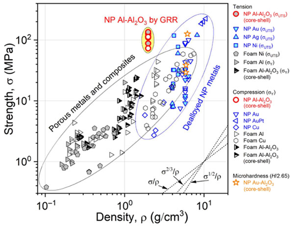 該團(tuán)隊(duì)將脫合金腐蝕與置換反應(yīng)(GRR)相結(jié)合,成功制備出無(wú)裂紋的高質(zhì)量納米多孔鋁樣品。其孔棱直徑約為200納米,且孔棱表面覆蓋有自發(fā)生成且可自修復(fù)的氧化鋁納米殼層(圖1)。該納米氧化膜不僅阻止材料進(jìn)一步氧化和自燃,而且大幅降低表面擴(kuò)散速率,從而提高納米多孔鋁的熱穩(wěn)定性。該材料納米多孔結(jié)構(gòu)在接近鋁熔點(diǎn)溫度下仍能保持穩(wěn)定而不發(fā)生顯著結(jié)構(gòu)粗化。由于該材料較好的多孔結(jié)構(gòu)聯(lián)結(jié)性和優(yōu)異的承載效率,以及表面氧化膜的強(qiáng)化作用,納米多孔鋁在拉伸和壓縮條件下均表現(xiàn)出高強(qiáng)度。其強(qiáng)度遠(yuǎn)高于同等密度傳統(tǒng)泡沫金屬材料。與已報(bào)道的納米多孔金屬相比,納米多孔鋁不僅更穩(wěn)定,而且密度更低,比強(qiáng)度更高(圖2)。該研究不僅為發(fā)展新型輕質(zhì)高強(qiáng)度新材料提供新思路,也為探索高溫等極限條件下納米多孔金屬功能應(yīng)用提供契機(jī)。