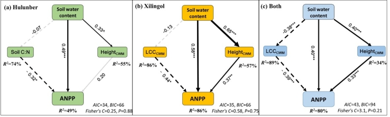 以上結(jié)果表明,我國溫帶草原長期處于水分缺乏的自然條件下,植物在長期的進化過程中,形成了適應(yīng)干旱生境的逆境屬性,致使植物群落性狀均值成為了調(diào)控草原初級生產(chǎn)力應(yīng)對干旱環(huán)境的主要驅(qū)動因素。在草地資源的管理和利用過程中要重視物種的功能屬性及土壤養(yǎng)分在維持草地群落功能及穩(wěn)定性過程中的重要作用,該結(jié)果證明了溫帶草原植物群落性狀的種內(nèi)、種間互補性的重要意義,有助于解釋草原植物群落性狀變化規(guī)律及其與群落生產(chǎn)力的關(guān)系,完善草本植物的生長及功能生態(tài)適應(yīng)機制。