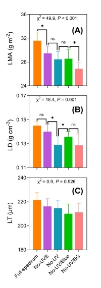 植物功能性狀通常反映環(huán)境變化下植物資源獲取和投資之間的權(quán)衡策略。植物葉片,作為將無機碳轉(zhuǎn)化為有機碳的主要器官,其比葉面積(即單位面積的葉片質(zhì)量,LMA) 表征著葉片形態(tài)、生理和生化功能,以及生態(tài)系統(tǒng)特征和過程,是“葉片經(jīng)濟譜(Leaf Economics Spectrum)”理論的核心性狀。因此,準確理解LMA變化的非生物驅(qū)動因素以及LMA的結(jié)構(gòu)和組成基礎(chǔ),是我們預測陸地生態(tài)系統(tǒng)功能對氣候變化響應(yīng)的關(guān)鍵。大量的前期研究探討了LMA及其組成對自然界各種環(huán)境變化的響應(yīng),證實光是驅(qū)動LMA變化的主導因子,其重要性遠超溫度、水分、養(yǎng)分、CO2等其他條件。但是,由于太陽光由不同波段的光譜組成,而以往主要集中在可見光波段的光強研究,以至于到目前為止,缺少對光譜分區(qū)作用機理的理解。