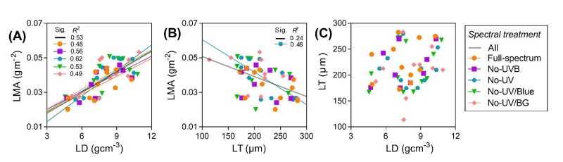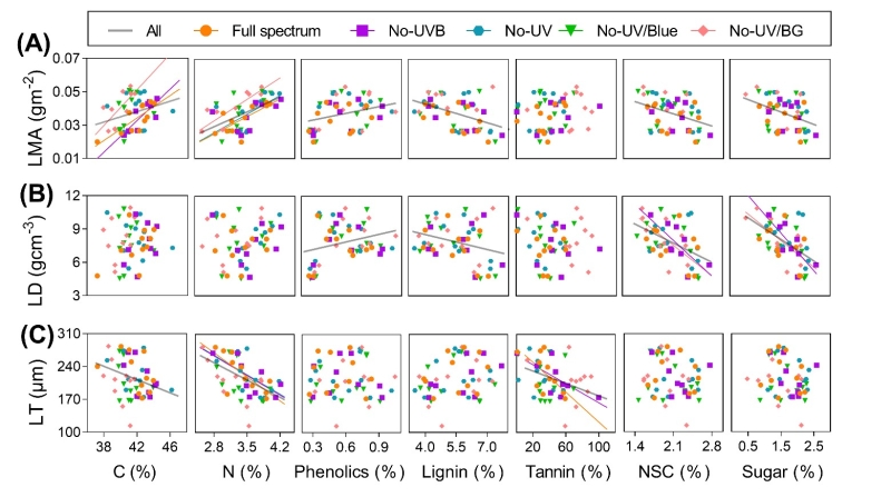 基于此,我所森林生態(tài)系統(tǒng)管理組選擇溫帶森林11種常見草本植物作為材料,對冠層光譜進行衰減處理,準確量化了LMA及其結(jié)構(gòu)組成(葉片密度 厚度=LMA)、以及葉片質(zhì)量相關(guān)的元素含量和次生代謝物的光譜響應(yīng)。結(jié)果顯示,在相同光強條件下,LMA 變化受UV-B輻射(280-315nm)和綠光(500-600nm)驅(qū)動,在結(jié)構(gòu)上主要取決于密度而不是厚度。且LMA和密度,均與單位質(zhì)量的木質(zhì)素、非結(jié)構(gòu)性碳水化合物和可溶性糖顯著負相關(guān)關(guān)系,說明植物在葉片結(jié)構(gòu)和代謝功能之間的資源分配存在著權(quán)衡策略,即植物傾向于將更多生物量優(yōu)先投資到葉片結(jié)構(gòu)。這一研究成果,明確了驅(qū)動LMA變化的主導光譜,突破了以光強為研究核心的傳統(tǒng)認知;進一步闡明了無論光強如何變化,冠層太陽輻射的光譜組成均可以通過調(diào)整資源投資和結(jié)構(gòu)支撐的關(guān)系,來調(diào)節(jié)LMA,有助于理解陸地植物對地球環(huán)境變化的適應(yīng)策略,和預測陸地生態(tài)系統(tǒng)功能的響應(yīng)特征。
