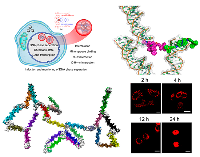 本工作中,合作團隊提出了一種具有高度DNA親和性及光開關(guān)屬性的金屬釕配合物以實現(xiàn)活體細胞DNA分子相分離過程的實時檢測。此外,金屬釕配合物在體內(nèi)外均顯示出有效的腫瘤抑制活性。李國輝團隊通過多尺度分子動力學模擬,闡明了釕配合物通過正電親脂性三苯基膦取代基和柔性長烷基鏈在DNA分子之間形成多價結(jié)合力以誘導DNA相分離的微觀分子機制。本研究為誘導活體細胞相分離的介入試劑設(shè)計提供新的思路。