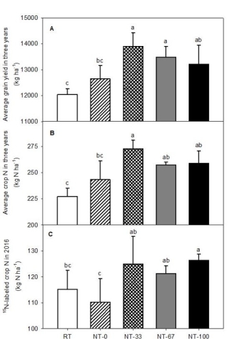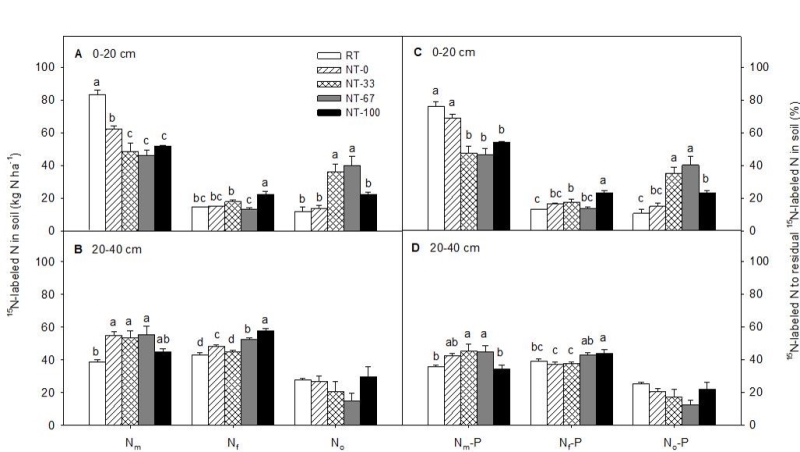 1. 在農(nóng)民常規(guī)量施肥條件下,肥料氮施入土壤后,玉米苗期0-20cm土層,主要是通過微生物的同化作用使其轉(zhuǎn)化成有機(jī)氮,20-40cm土層主要是通過粘土礦物的固定作用轉(zhuǎn)化成固定態(tài)銨,與傳統(tǒng)壟作(RT)和免耕無秸稈覆蓋(NT0)處理相比,免耕不同量秸稈覆蓋(NT33、NT67和NT100)在維持較高玉米產(chǎn)量的同時,通過提高肥料氮向土壤有機(jī)氮庫和固定態(tài)銨庫的轉(zhuǎn)化比例,有效降低了作物需氮低峰期(玉米苗期)肥料氮的損失風(fēng)險,提高了肥料氮的利用效率。相關(guān)研究以“Effects of no-tillage and stover mulching on the transformation and utilization of chemical fertilizer N in Northeast China” 為題發(fā)表在Soil & Tillage Research上,中山大學(xué)陳懷海副教授和沈陽生態(tài)所物質(zhì)循環(huán)組博士研究生劉巖為共同第一作者,魯彩艷研究員和遲光宇副研究員為共同通訊作者。該研究得到了王寬誠教育基金、國家自然科學(xué)基金、遼寧省重點研發(fā)計劃等項目的資助。