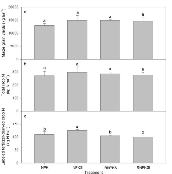 2. 與免耕100%秸稈覆蓋常規(guī)量施肥措施相比,免耕100%秸稈覆蓋減肥20%及其配施抑制劑處理可進(jìn)一步降低肥料氮通過硝化-反硝化和淋溶途徑發(fā)生的損失量,提高肥料氮的作物利用效率和土壤中保持能力,肥料減施20%及其配施抑制劑處理玉米產(chǎn)量略有降低,但差異不顯著,這一結(jié)果說明在免耕100%秸稈還田條件下減少肥料的施用量具有可行性。上述結(jié)果以“Stover mulching and inhibitor application maintain crop yield and decrease fertilizer N input and losses in no-till cropping systems in Northeast China”為題發(fā)表在Agriculture, Ecosystems and Environment上。沈陽生態(tài)所農(nóng)業(yè)生態(tài)工程組博士研究生袁磊和陳欣研究員為共同第一作者,魯彩艷研究員通訊作者。該研究得到了國家自然科學(xué)基金、王寬誠教育基金、遼寧省重點研發(fā)計劃等項目的資助。
