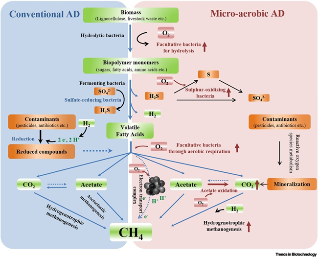 厭氧消化技術(shù)在有機固廢資源化以及可再生能源生產(chǎn)領(lǐng)域受到越來越多的關(guān)注。然而由于秸稈類有機固廢結(jié)構(gòu)復(fù)雜,其厭氧消化往往存在產(chǎn)氣效率低、發(fā)酵周期長的問題。針對此問題,青島能源所郭榮波研究員帶領(lǐng)的工業(yè)生物燃?xì)庵行幕谏镎{(diào)控策略創(chuàng)新性提出厭氧消化的微好氧調(diào)控技術(shù),并取得系列成果(Bioresource Technology, 2015, 175, 203-208; Chemical Engineering Journal, 2016, 287, 523-528; Fuel, 2022, 318, 123604; Renewable Energy,2022, 195, 1194-1201; Bioresource Technology,2022, 359, 127454)。在此基礎(chǔ)上,近期該研究組聯(lián)合丹麥技術(shù)大學(xué)厭氧消化領(lǐng)域權(quán)威專家IriniAngelidaki在生物技術(shù)領(lǐng)域權(quán)威期刊Trends in Biotechnology中發(fā)表關(guān)于微好氧調(diào)控技術(shù)的綜述文章。 Trends in Biotechnology隸屬于Cell press,主要刊登關(guān)于應(yīng)用生物技術(shù)領(lǐng)域的綜述和觀點,創(chuàng)刊以來刊登過許多重大的生命科學(xué)研究進(jìn)展,最新發(fā)布的影響因子為21.942,中科院分一區(qū)Top期刊(排名4/293位)。