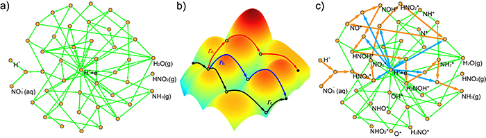 肖建平團(tuán)隊(duì)在前期的工作中開發(fā)了基于圖論的反應(yīng)網(wǎng)絡(luò)研究新型算法(ACS Catal.,2021),以“理論先行”設(shè)計(jì)了銅基催化劑應(yīng)用于一氧化氮電催化合成氨(Angew. Chem. Int. Ed., 2020)。團(tuán)隊(duì)基于電催化動(dòng)力學(xué)模型,解釋了電極電勢對(duì)一氧化氮電催化產(chǎn)物選擇性的影響(J. Phys. Chem. Lett.,2021)。系列成果在團(tuán)隊(duì)關(guān)于氮氧化物(NOx)電催化合成氨的綜述文章中進(jìn)行了詳細(xì)闡述(ChemPlusChem,2021)。