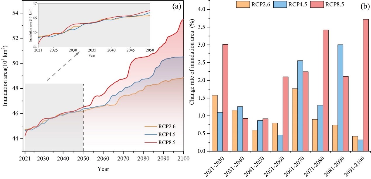 圖1 三種情景下至2100年中國(guó)海岸帶可能最大淹沒(méi)面積(a)及其變化率(b)