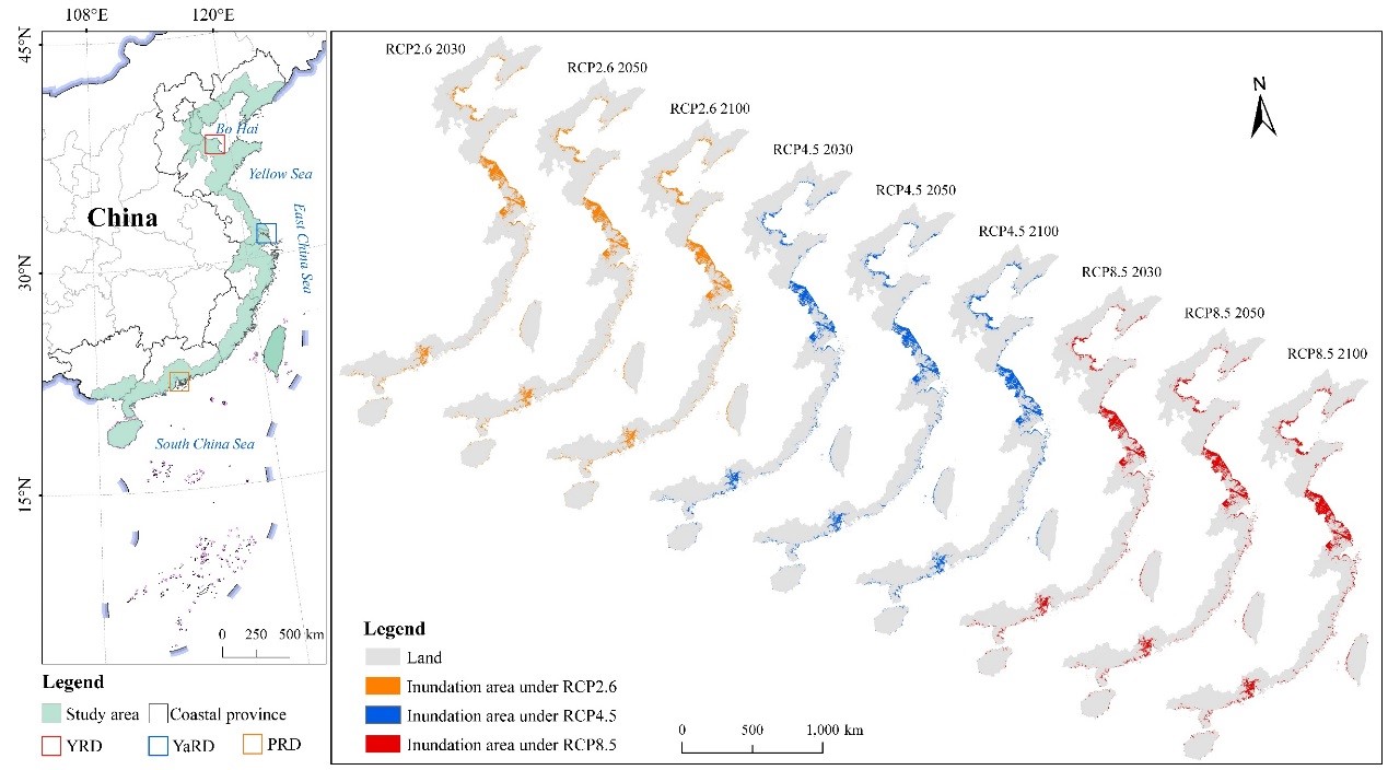 在氣候變化對(duì)沿海地區(qū)產(chǎn)生的所有威脅中,海平面上升(SLR)導(dǎo)致的洪水淹沒(méi)被認(rèn)為是最嚴(yán)重的威脅之一,對(duì)海岸帶的生態(tài)環(huán)境、經(jīng)濟(jì)社會(huì)發(fā)展和人類生活都產(chǎn)生極大的負(fù)面影響。中國(guó)海岸帶區(qū)域南北跨度大,自然地理和經(jīng)濟(jì)社發(fā)展特征也極為多樣化,未來(lái)時(shí)期海平面上升導(dǎo)致的洪水淹沒(méi)特征及綜合風(fēng)險(xiǎn)具有顯著的復(fù)雜性和時(shí)空異質(zhì)性,給沿海政府部門制定行之有效的適應(yīng)性政策和措施帶來(lái)很大的挑戰(zhàn)。