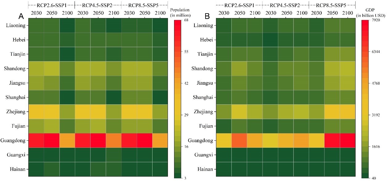 圖3 RCP2.6-SSP1、RCP4.5-SSP2、RCP8.5-SSP5情景下2030、2050、2100年不同省份典型風(fēng)險(xiǎn)區(qū)預(yù)計(jì)影響的人口(A)和GDP數(shù)量(B)