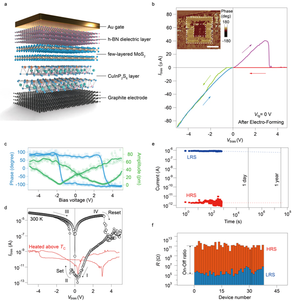 圖1 器件結構設計及兩端鐵電憶阻器的存儲性能。a)器件結構示意圖。b)器件的阻變行為。c)少層CuInP2S6的壓電力顯微鏡相位和幅值圖。d)器件在不同溫度下的輸運行為。e)存儲器的數據保持能力測試。f)存儲器開關比統(tǒng)計圖。