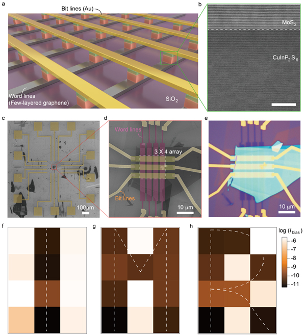 圖2 鐵電憶阻器存儲陣列演示。a)二維鐵電RAM結構示意圖。b)CuInP2S6/MoS2界面的HAADF-STEM照片。c)3 4陣列的SEM圖像。d)局部放大圖。e)3 4陣列的光學照片。f-g)通過讀取3 4陣列中每個交叉點的高阻態(tài)和低阻態(tài)編碼的“I”、“M”和“R”的簡化字母。