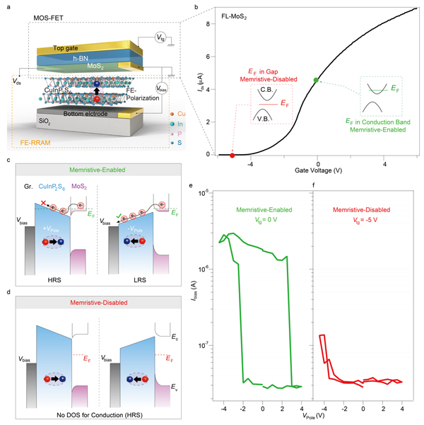 圖3 器件的可編程存儲特性。a)器件結構示意圖。b)MoS2層的轉移特性曲線。c-d)異質結的能帶結構圖。e-f)通過施加門電壓實現(xiàn)了對存儲窗口從有到無的調控。
