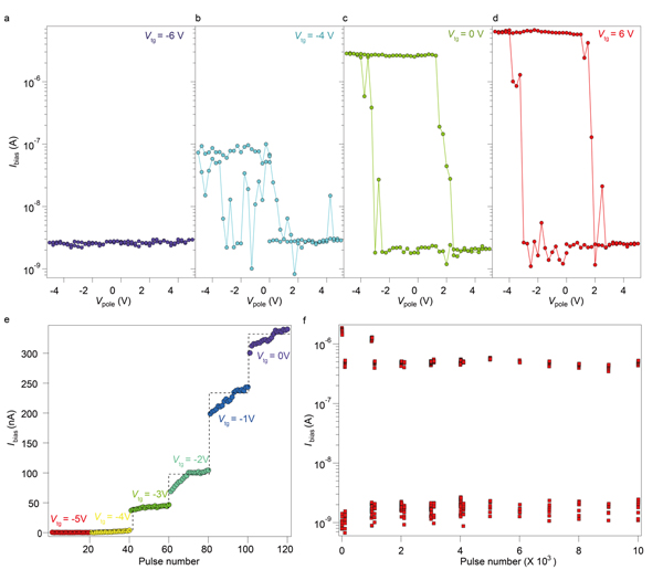 圖4 門電壓可編程存儲器的多阻態(tài)存儲特性。a-d)器件在不同門電壓下的存儲窗口。e)器件的多阻態(tài)存儲性能演示。f)柵極調控的耐疲勞特性。