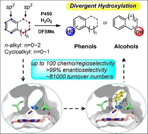 研究人員在人工P450過加氧酶催化的烷基苯羥化反應(yīng)中發(fā)現(xiàn),外源雙功能小分子對反應(yīng)產(chǎn)物的化學(xué)、區(qū)域和立體選擇性均有一定影響,由此萌生了利用外源分子調(diào)控和干預(yù)工程化酶催化行為的思路,進而開發(fā)出外源分子協(xié)同P450酶共進化的蛋白質(zhì)工程新策略,獲得了分別適配不同雙功能小分子的多個不同版本的P450BM3突變酶,通過這些雙功能小分子與突變酶的特定組合,分別實現(xiàn)了對烷基苯全部潛在羥化產(chǎn)物中半數(shù)以上的高度區(qū)域和立體選擇性羥化,化學(xué)選擇性和區(qū)域選擇性最高均可達>99%,對映選擇性最高可達>99% ee,最高催化轉(zhuǎn)化數(shù)(total turnover numbers)可達81000,催化性能遠優(yōu)于目前任何已報道的天然或工程P450酶。此外,研究人員還通過共結(jié)晶結(jié)構(gòu)解析、大分子動力學(xué)模擬以及量化計算深入研究了產(chǎn)生高度選擇性的分子基礎(chǔ)和酶化學(xué)機制,揭示了羥化過程中不同外源分子與突變酶組合對不同反應(yīng)位點碳-氫鍵的偏好性和產(chǎn)物特異性的協(xié)同控制效應(yīng)。上述工作為實現(xiàn)在任意位點對給定底物進行羥化編輯修飾提供了新的思路和策略,顯示了外源分子協(xié)同酶催化策略在拓展生物酶催化在合成化學(xué)中的應(yīng)用邊際方面的巨大潛力。
