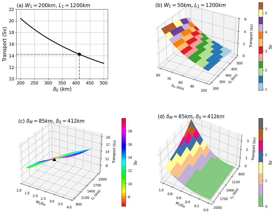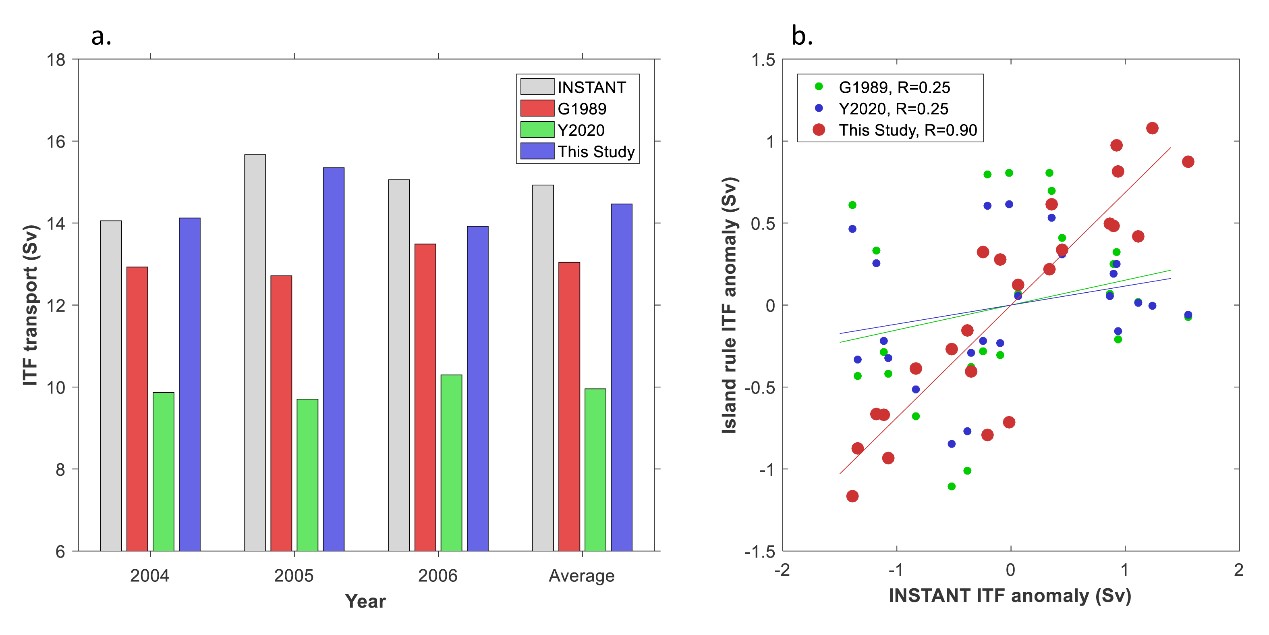 團隊基于所得到的三島嶼繞島環(huán)流解析解,估算了印尼貫穿流的體積輸運并與INSTANT觀測、MITF等觀測時間序列以及前人的理論值進行了對比。結果表明該三島嶼繞島環(huán)流理論可以很好地再現印尼貫穿流體積輸運的平均值和年際變化,相較于原始的Godfrey繞島環(huán)流理論具有明顯的進步。研究團隊進一步基于該解析解開展了敏感性試驗,研究了島嶼分布、海峽通道尺寸、摩擦邊界層厚度等因素變化對多島嶼繞島環(huán)流框架下印尼貫穿流輸運估計的影響,得到了一些有意義的結果。
