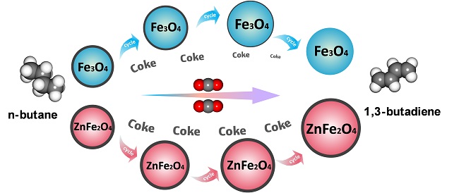 在本工作中,團隊系統(tǒng)探究了ZnFe2O4和Fe2O3催化劑的構(gòu)效關(guān)系:ZnFe2O4具有較強CO2吸附能力,導致其表面易發(fā)生重整反應(yīng),加之其易燒結(jié)的特點,在反應(yīng)過程中表現(xiàn)出快速和不可逆失活特征(0.77h-1 1.00h-1);而Fe2O3催化劑因其良好的補氧釋氧能力和弱CO2吸附能力,表現(xiàn)出高的丁二烯選擇性(約40%)和低的失活速率(0.19h-1)。