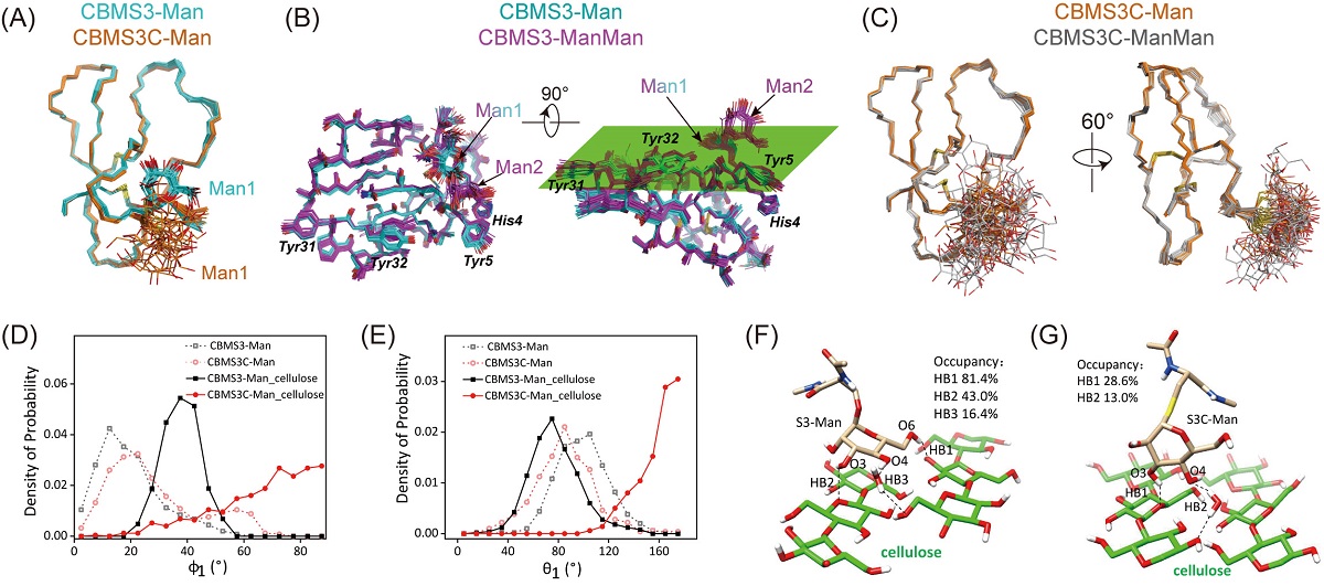 圖1 硫-糖基化與氧-糖基化所產(chǎn)生的結(jié)構(gòu)與動(dòng)力學(xué)差異導(dǎo)致了兩種糖基化對(duì)蛋白質(zhì)性質(zhì)的不同影響。(A-C)硫-糖基化的CBM(CBMS3C-Man和CBMS3C-ManMan)與氧-糖基化的CBM(CBMS3-Man和CBMS3-ManMan)的結(jié)構(gòu)差異。硫-糖基化的結(jié)構(gòu)所連接的糖基呈現(xiàn)柔性松散狀態(tài)而氧-糖基化的結(jié)構(gòu)所連接的糖基呈現(xiàn)為收斂的固定結(jié)構(gòu)。(D-F)分子動(dòng)力學(xué)模擬顯示結(jié)合纖維素底物后,硫-糖基化的CBM的糖基具有比O-糖基化的糖基更多的運(yùn)動(dòng)性和更少的氫鍵占有率,共同導(dǎo)致其結(jié)合底物能力變?nèi)酢?span>