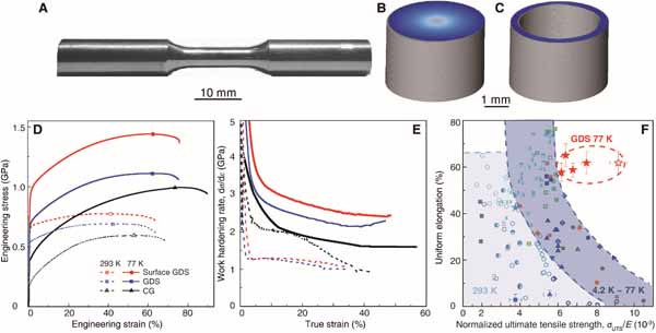圖1 梯度位錯(cuò)結(jié)構(gòu)(GDS)合金及其典型低溫力學(xué)行為。 (A)狗骨頭棒狀宏觀拉伸樣品;(B) 樣品截面示意圖,顯示自表(深藍(lán)色)及芯(淺灰色)梯度結(jié)構(gòu)分布;(C) 梯度位錯(cuò)管狀樣品標(biāo)距段三維X-射線重構(gòu)形貌(管壁厚度~0.45 mm );(D) GDS, 管狀GDS和粗晶的拉伸工程應(yīng)力-應(yīng)變曲線和 (E) 真應(yīng)力-應(yīng)變曲線; (F) 均勻塑性與歸一化抗拉強(qiáng)度曲線, 表明梯度位錯(cuò)結(jié)構(gòu)合金的優(yōu)異低溫綜合力學(xué)性能。