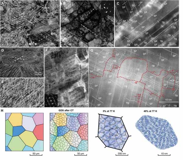 圖2 梯度位錯(cuò)結(jié)構(gòu)表層77 K拉伸結(jié)構(gòu)演變特征。拉伸應(yīng)變3%時(shí)截面SEM (A) 和TEM (B) 結(jié)果,晶粒內(nèi)不同滑移面上相互交割的層錯(cuò)束穿過(guò)多個(gè)位錯(cuò)胞;(C) 對(duì)應(yīng)的HAADF-STEM結(jié)果表明層錯(cuò)束包含超高密度的層錯(cuò)和孿晶結(jié)構(gòu)。拉伸應(yīng)變40%時(shí)截面SEM (D-E) 和TEM (F) 結(jié)果,晶粒內(nèi)已產(chǎn)生高密度細(xì)化結(jié)構(gòu)-納米層錯(cuò)疇;(G) 對(duì)應(yīng)的HAADF-STEM結(jié)果表明位錯(cuò)胞被極小層錯(cuò)疇進(jìn)一步細(xì)化;(H) 77 K拉伸變形過(guò)程中由原始位錯(cuò)胞逐漸轉(zhuǎn)變?yōu)楦呙芏葋喪{米層錯(cuò)疇的動(dòng)態(tài)結(jié)構(gòu)細(xì)化示意圖。