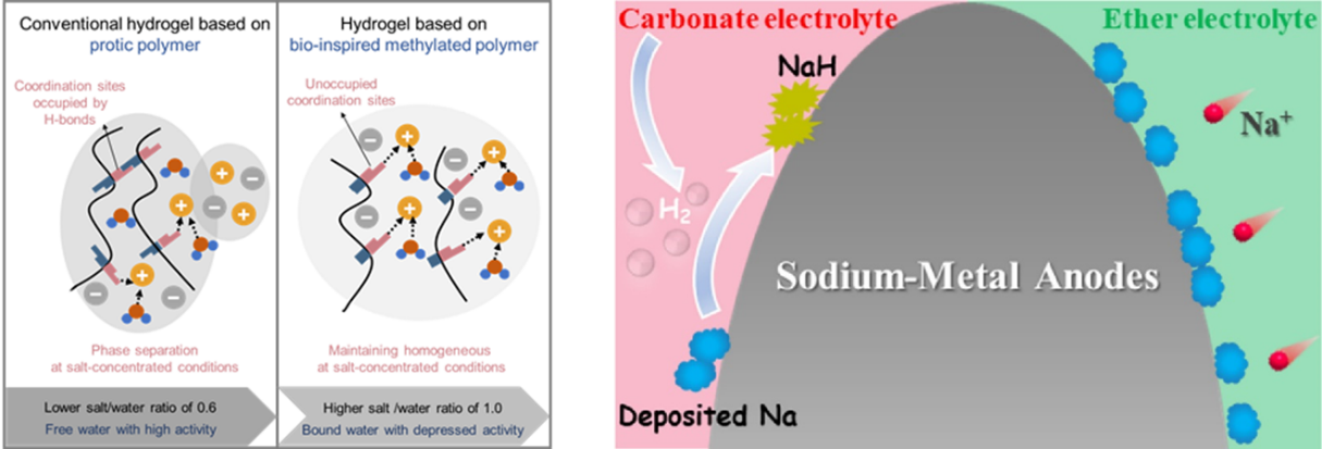 近期,固態(tài)能源系統(tǒng)技術(shù)中心在低成本鈉離子電池領(lǐng)域再獲重要進(jìn)展,研究成果相繼發(fā)表在國際權(quán)威期刊《Angew. Chem. Int. Ed.》、《Adv. Energy Mater.》和《Energy Storage Mater.》上(圖1)。針對傳統(tǒng)水系電解質(zhì)中的自由水分子導(dǎo)致析氫、電極金屬離子溶出等問題,研究團(tuán)隊通過甲基化調(diào)節(jié)氫鍵作用獲得了鈉離子電池超高濃聚合物電解質(zhì)新體系,鈉電池的循環(huán)穩(wěn)定性實現(xiàn)突破性提高(Angew. Chem. Int. Ed. 2023, e202311589)。同時,研究團(tuán)隊發(fā)現(xiàn)鈉金屬負(fù)極SEI中NaH是影響電池性能的主要因素,是導(dǎo)致鈉電池失效的一種重要機(jī)制,NaH是由電池循環(huán)中產(chǎn)生的氫氣和已沉積的金屬鈉自發(fā)反應(yīng)生成的(Energy Storage Mater. 2023, 61, 102891)。研究團(tuán)隊針對當(dāng)前鈉離子電池電解質(zhì)領(lǐng)域,進(jìn)一步總結(jié)了當(dāng)前鈉離子電池電解質(zhì)中的基礎(chǔ)原理和研究進(jìn)展,并對電解質(zhì)未來發(fā)展方向進(jìn)行了展望(Adv. Energy Mater. 2023, 2301758)。