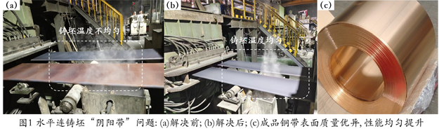 針對(duì)江銅集團(tuán)對(duì)銅板帶躋身國(guó)內(nèi)一流銅材企業(yè)的需求,金屬所科研團(tuán)隊(duì)于2021年1月1日起與江銅銅板帶公司開展“全面提升現(xiàn)有水平連鑄銅板帶產(chǎn)品質(zhì)量及穩(wěn)定性和成品率”項(xiàng)目研究。經(jīng)過(guò)兩年多的合作,在銅加工行業(yè)首次實(shí)現(xiàn)了銅合金水平連鑄板坯的在線超聲檢測(cè),可對(duì)板坯內(nèi)部孔洞類缺陷和裂紋缺陷進(jìn)行實(shí)時(shí)圖像顯示和數(shù)據(jù)采集及處理。建立了水平連鑄結(jié)晶器冷卻水流動(dòng)-多形式換熱-板坯凝固的多場(chǎng)耦合模型,實(shí)現(xiàn)鑄坯溫度場(chǎng)和組織場(chǎng)的準(zhǔn)確模擬計(jì)算。在此基礎(chǔ)上,進(jìn)行了銅套結(jié)構(gòu)和石墨模具材質(zhì)及結(jié)構(gòu)的優(yōu)化設(shè)計(jì),調(diào)控了板坯熔鑄溫度場(chǎng)分布,解決了行業(yè)內(nèi)普遍存在的鑄坯單側(cè)晶粒粗大問(wèn)題及陰陽(yáng)帶問(wèn)題。團(tuán)隊(duì)還創(chuàng)新性提出青銅水平連鑄坯“預(yù)軋-退火-粗軋”工藝路線,有效促進(jìn)了鑄坯孔洞缺陷愈合,提升軋后帶材表面質(zhì)量,解決了行業(yè)內(nèi)青銅板帶軋制起皮缺陷難以控制的共性問(wèn)題。該技術(shù)可顯著提升銅板帶成品率,使江銅集團(tuán)的青銅生產(chǎn)水平達(dá)到國(guó)內(nèi)一流水平,提高了其技術(shù)水平和市場(chǎng)競(jìng)爭(zhēng)力。