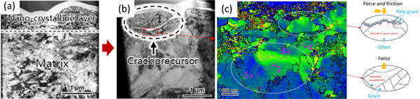 在中國科學(xué)院“高端軸承自主可控制造”戰(zhàn)略性先導(dǎo)科技專項的支持下,中國科學(xué)院金屬研究所材料腐蝕與防護(hù)中心王儉秋團(tuán)隊對于軸承鋼在模擬服役環(huán)境中表面損傷與制造工藝關(guān)系開展了系統(tǒng)研究。近期,吳迪項目研究員(通訊作者)和博士研究生夏卓凡(第一作者)等人,在前期重載滾動接觸疲勞失效機制研究的基礎(chǔ)上,設(shè)計了不同粗糙度等級的初始表面加工工藝,通過推力盤式滾動接觸疲勞試驗機進(jìn)行了相關(guān)實驗。發(fā)現(xiàn)高粗度表面深磨痕處的倒伏形貌可以作為表面裂紋的前驅(qū)體,伴隨形成的機加納米晶層中存在的大量微裂紋,促進(jìn)疲勞裂紋前期擴展(圖1)。通過降低粗糙度,更重要的是同時去除機加工納米晶層,可以使得滾動接觸疲勞壽命有著數(shù)倍乃至于數(shù)量級式的提高(圖2),而且這種對于加工工藝的調(diào)控所需要的成本較低,對提高軸承的使用壽命與穩(wěn)定性具有重要意義。此外,不同于以往認(rèn)為重載、低粗糙度條件下失效為亞表層引發(fā)剝落的觀點,本研究發(fā)現(xiàn)了一種新的失效機制,即重載、低粗糙度表面條件下,表面萌生裂紋逐級擴展形成達(dá)至亞表層深度的剝落,其主要依賴于表面凹痕產(chǎn)生的劇烈塑性變形,同時還有軸承鋼在超高服役周次(108)下表面形成的微塑性變形,增加了表面應(yīng)力集中和接觸表面間摩擦(圖3)。這為發(fā)展重載工況下具有超高滾動接觸疲勞壽命的高端軸承,提供了一種新的表面處理設(shè)計思路。