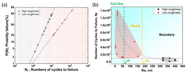 圖2.(a)兩種粗糙度等級下疲勞壽命的威布爾分布;(b)疲勞壽命隨粗糙度Ra的變化